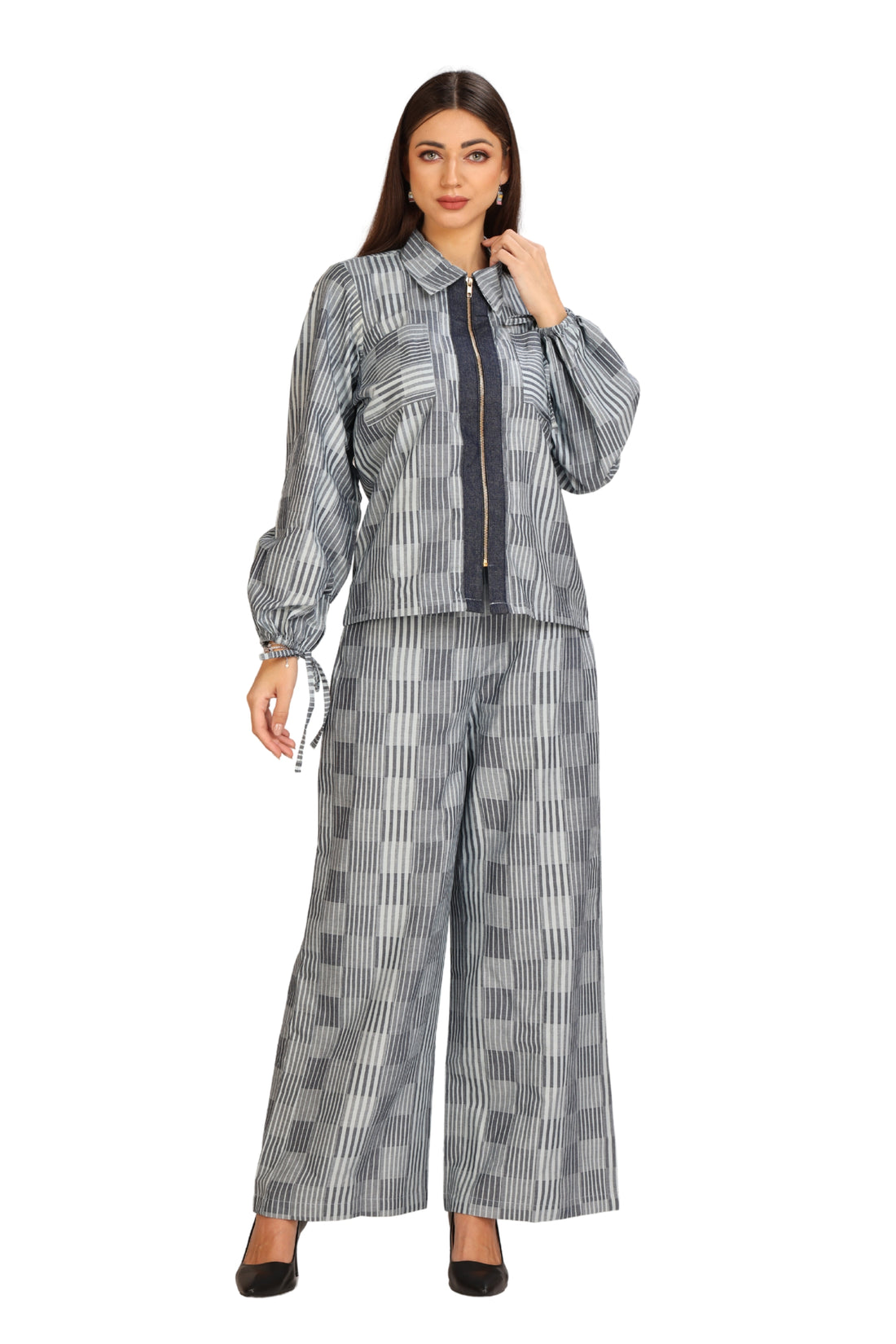 A modern co-ord that blends structure with ease. The shirt features a clean collar, a...