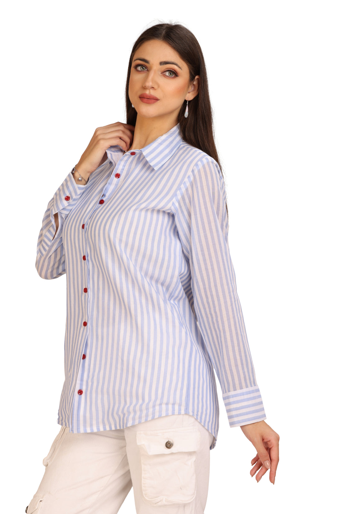 A clean, everyday stripe shirt with a touch of personality thanks to the contrast red...