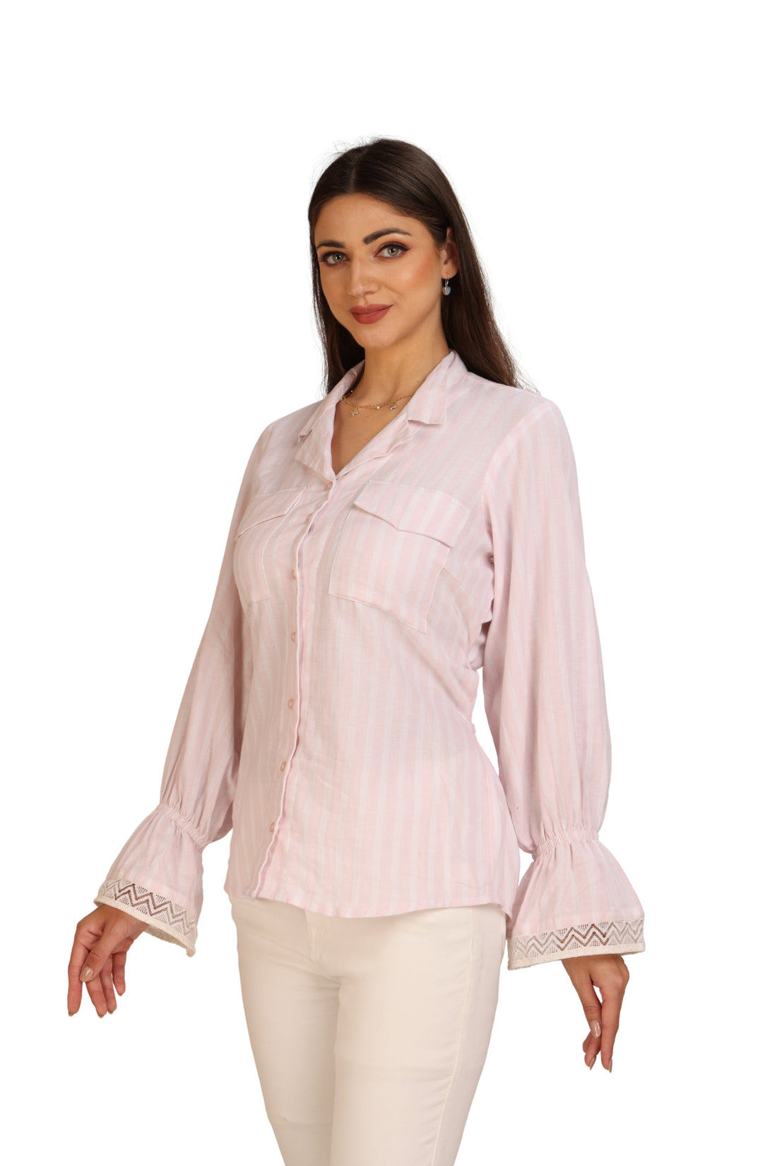 Pink & White Striped Flounce-Sleeve Shirt