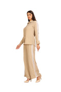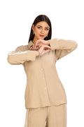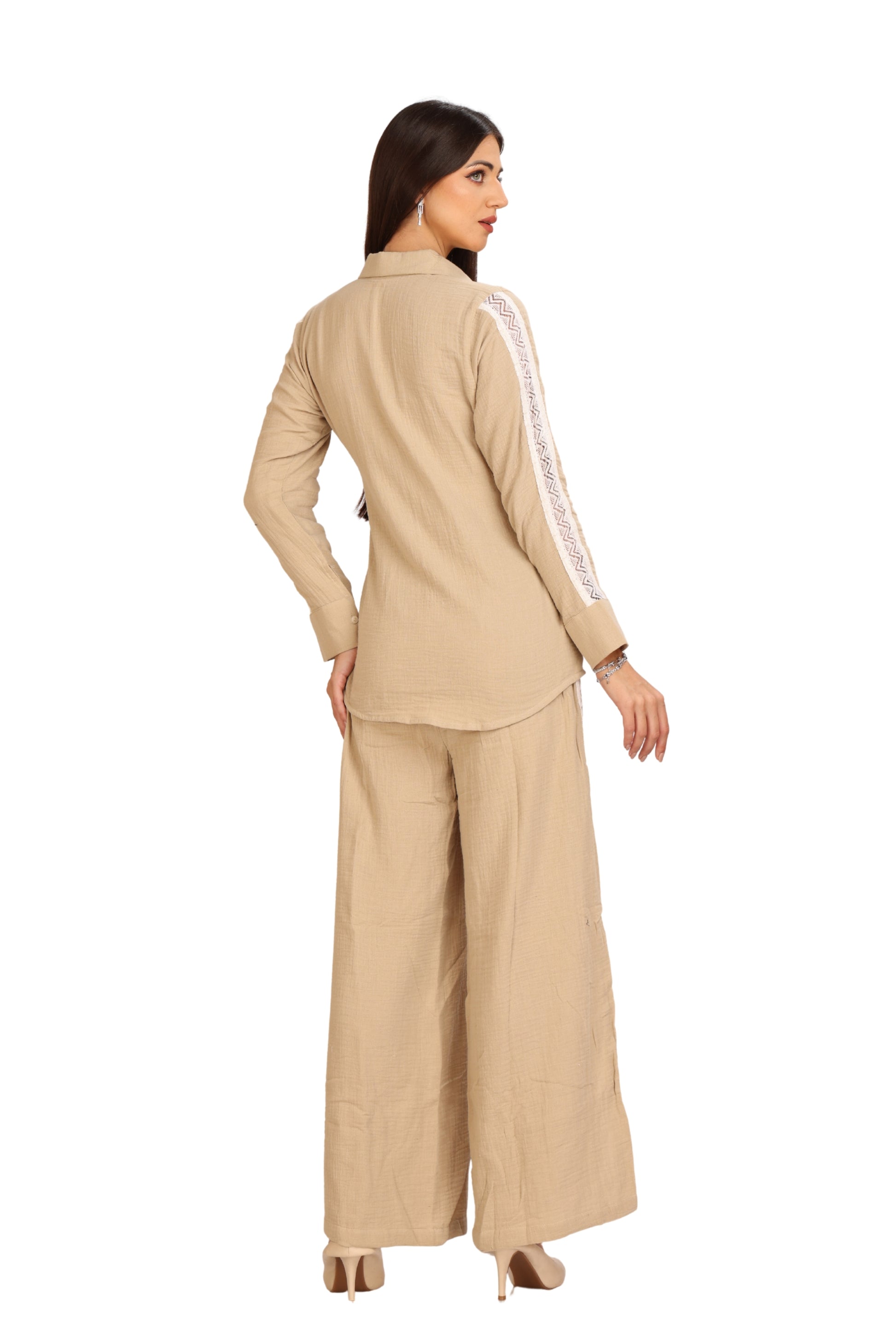 Experience effortless comfort and minimal elegance with this beige mull cotton co-ord set featuring a button-down full-sleeve shirt and relaxed-fit straight pants. The subtle embroidered lace detailing along the sleeves and side of the pants adds a chic handcrafted touch. Designed for all-day wear, this set offers style and ease for casual outings, travel looks, brunch meets, and work-from-home dressing.