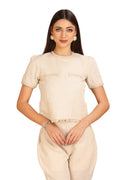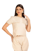 Elevate your wardrobe with this sophisticated beige tweed co-ord set, featuring a chic cropped top with subtle frayed hem and sleeve edges, paired with high-waisted tapered pants for a sleek, modern look. Crafted from high-quality tweed, this outfit delivers a polished yet comfortable style ideal for brunches, business casual settings, events, or day-to-night dressing. The clean lines and minimal detailing make it an effortlessly classy ensemble.