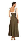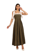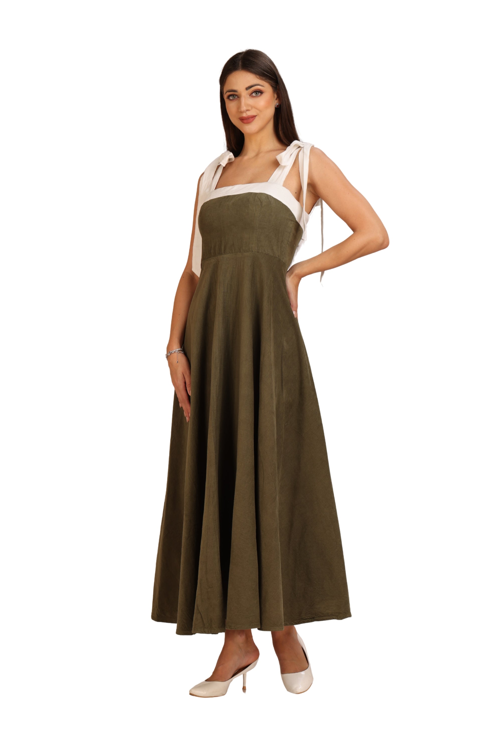 This elegant A-line maxi dress features a structured bodice with charming tie-up shoulder straps that allow adjustable fit and styling. Crafted from luxurious corduroy in a soothing green shade, the dress drapes beautifully, offering both comfort and sophistication. Perfect for brunches, vacation wear, evening gatherings, or festive occasions. The contrasting off-white ties add a graceful and feminine detail to the overall look.