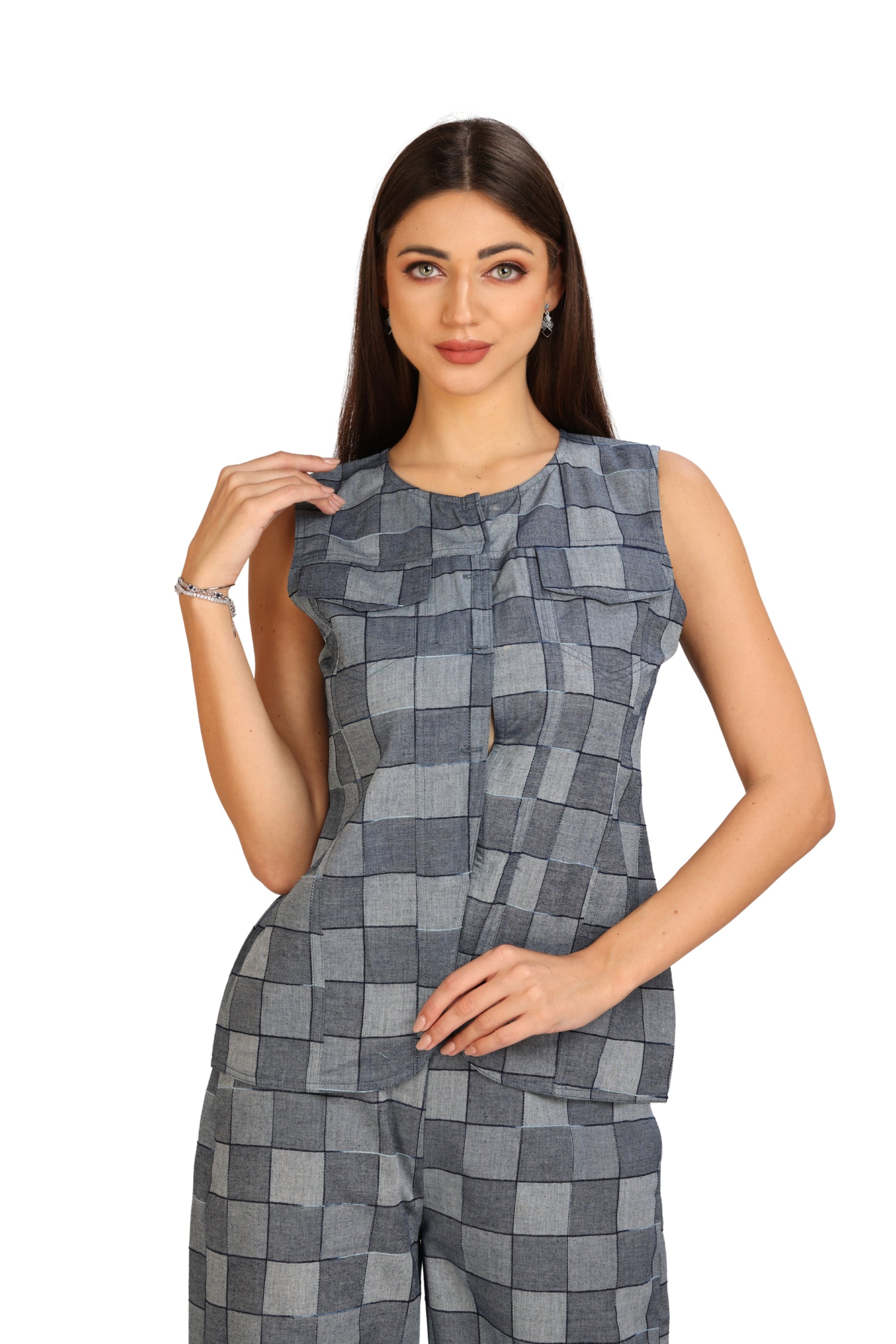 A clean, contemporary co-ord set in soft denim cotton with an indigo-toned check. The sleeveless top has an overlap slit that adds movement and a subtle hint of shape, while the wide-leg trousers keep the silhouette effortless and flattering. Perfect for travel days, brunch plans, or any moment that calls for style without trying too hard.