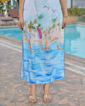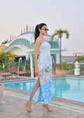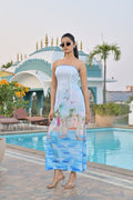 Designed for sun-soaked days, this strapless maxi dress features a serene sailboat print inspired by coastal escapes. The fitted bodice balances beautifully with the fluid skirt, while the airy linen-cotton fabric keeps it cool and effortless. Thoughtful contrast detailing along the neckline and sides adds a refined finish.